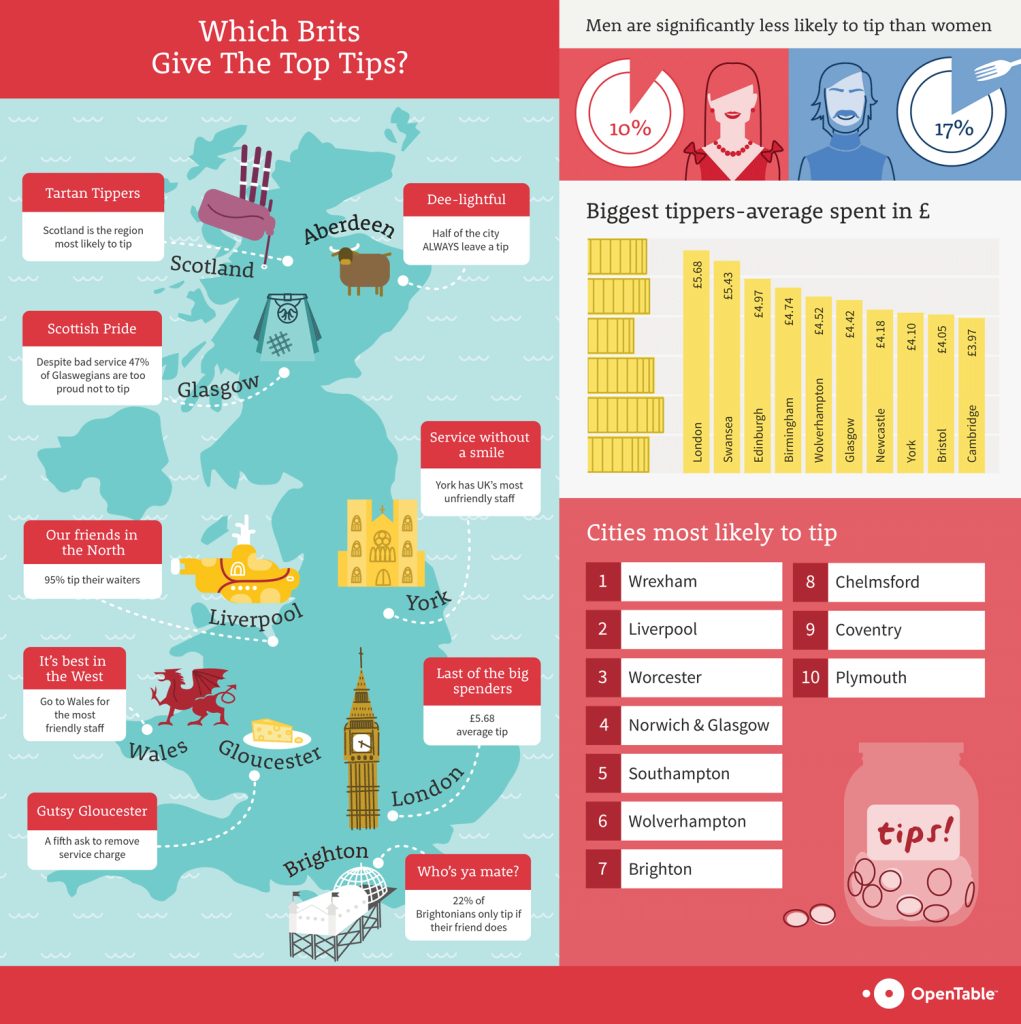London, 12 May 2015… British diners may have a reputation for being rather tight fisted when it comes to leaving a tip, but research released today by OpenTable, the world’s leading online restaurant booking service, has revealed some interesting insights into just how generous the different regions and cities in the UK are.